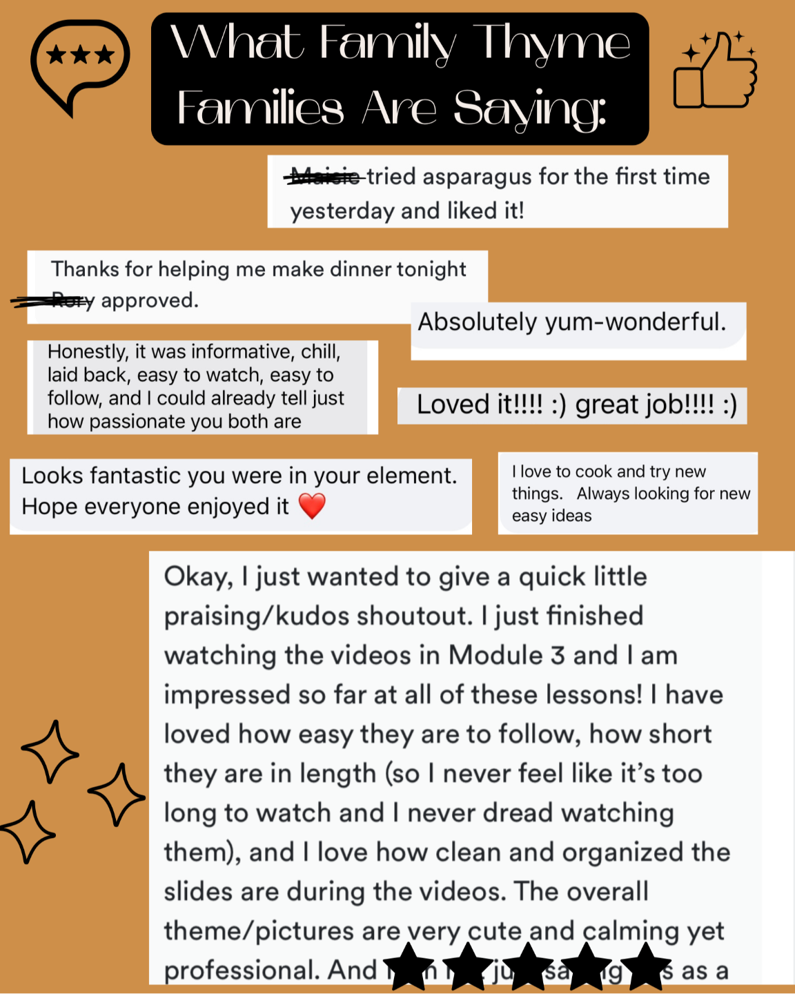 As a health coach and a professionally trained chef (and parents ourselves), we’ve combined nutrition science with practical cooking strategies to help families build healthy habits that actually stick. We've created what we call the T.H.Y.M.E Framework, and to help families like yours achieve the mealtimes they are constantly dreaming about!